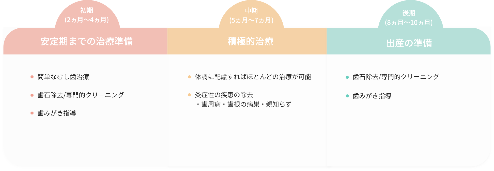 妊娠初期は、胎児の器官が形成される大切な時期であり、つわりなど体調の変化も大きい時期です。この時期はできるだけ応急処置にとどめ、本格的な治療は安定期に入ってから行うのが一般的です。 ただし、激しい痛みや腫れがある場合は我慢せず、必ず歯科医院へ相談しましょう。歯科用の麻酔は胎児への影響が少ないものが使われており、必要に応じて安全に処置が行えます。