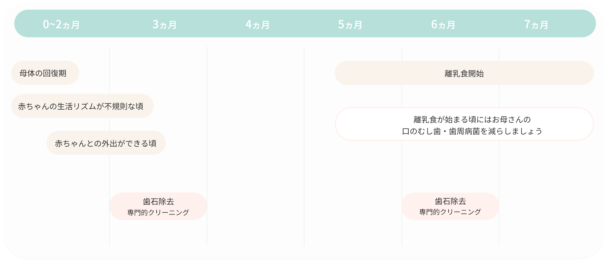 離乳食開始。 離乳食が始まる頃にはお母さんのお口の虫歯、歯周病菌を減らしましょう。 引き続き歯石除去、専門的クリーニングを行いましょう。